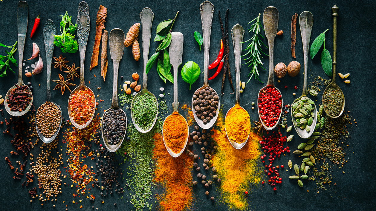 Three wooden spoons filled with different spices and herbs, including red paprika, yellow turmeric, and chopped green onions.